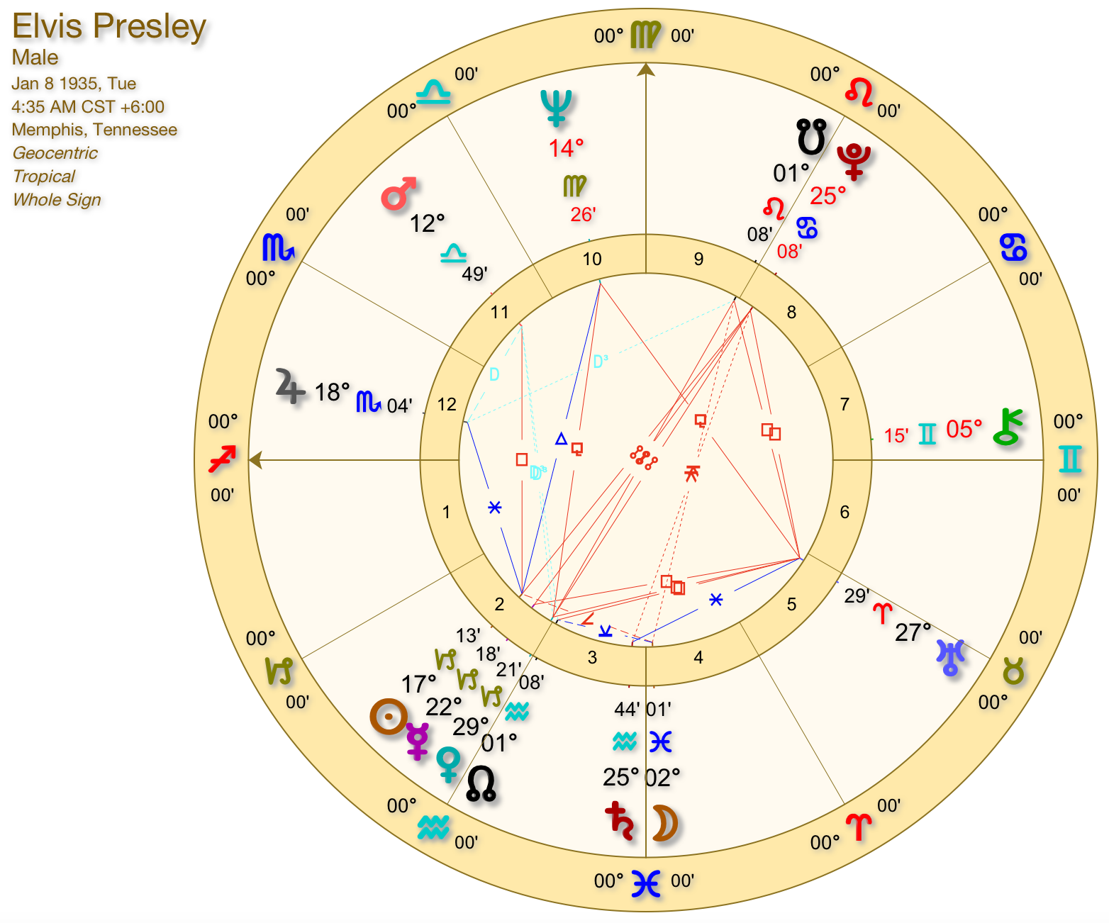 Sagittarius rising has a tendency to excess – especially their sweet tooth (Taurus 6th house). Elvis had enormous opportunities (sextiles) to find large social networks, get in front of crowds, and express his creative sexual side in a larger-than-life way (Asc. Lord Jupiter in Scorpio). This is also a money-generating aspect in any natal chart – but I digress.